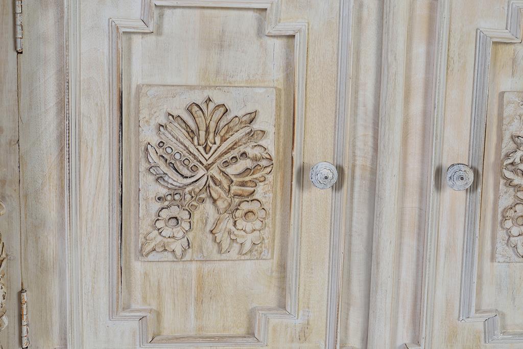 APARADOR 2 PUERTAS Y 2 CAJONES EN MADERA DE MANGO, TALLADO A MANO Y CON ESTANTES INTERIORES.