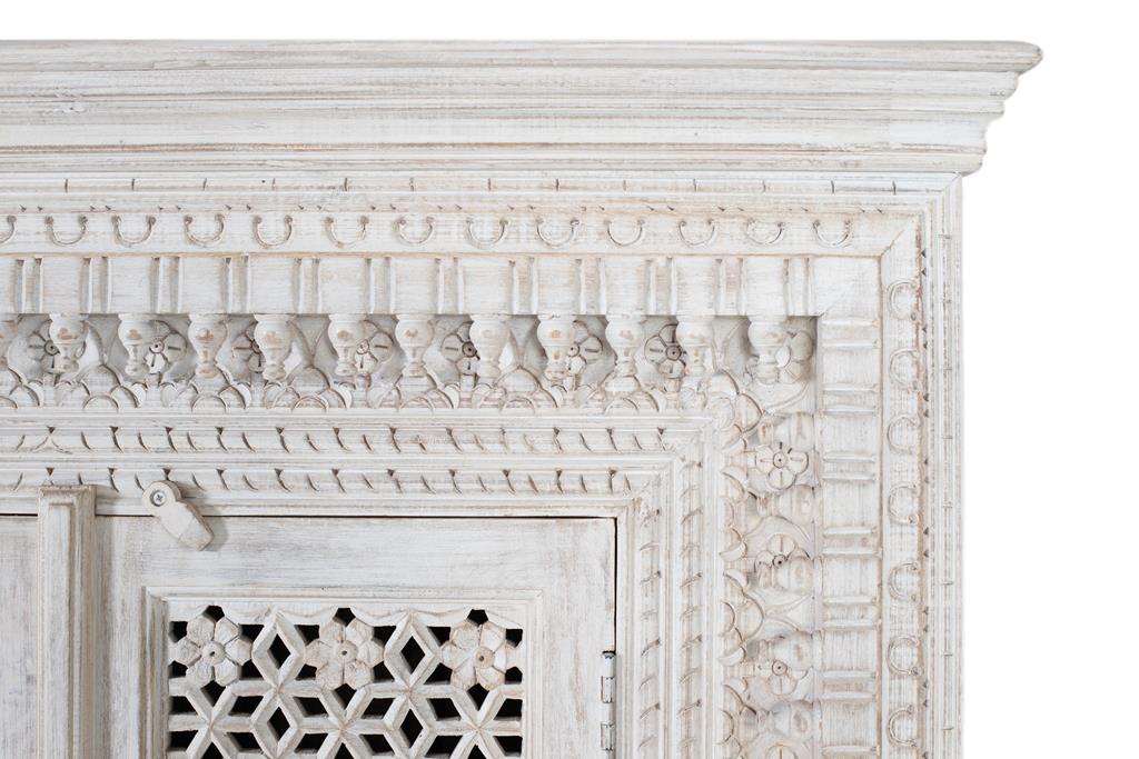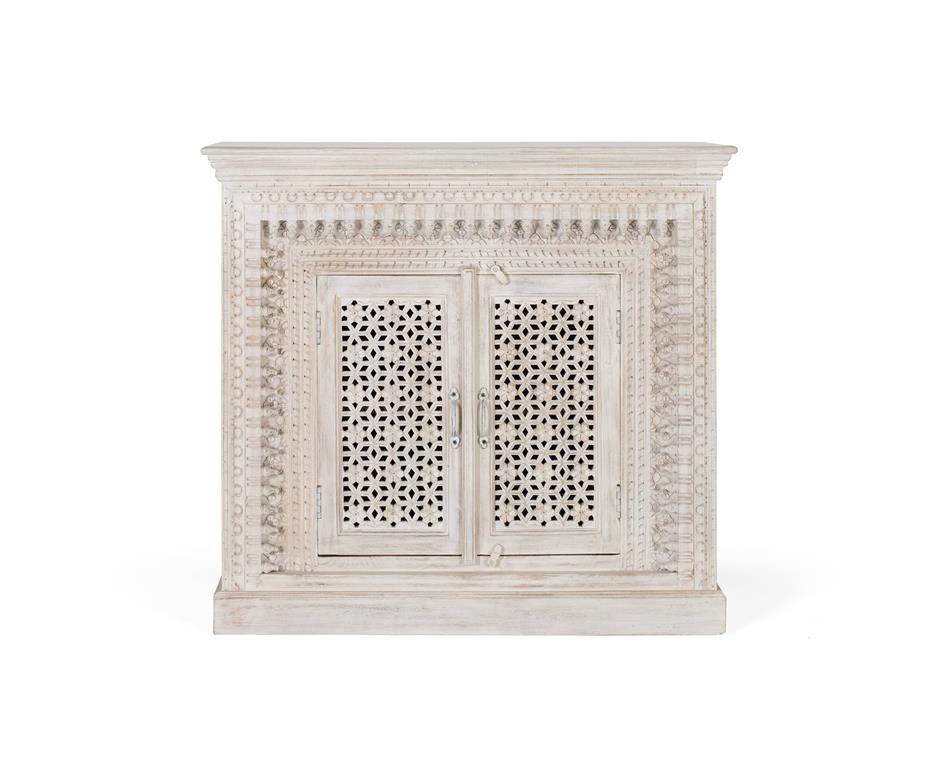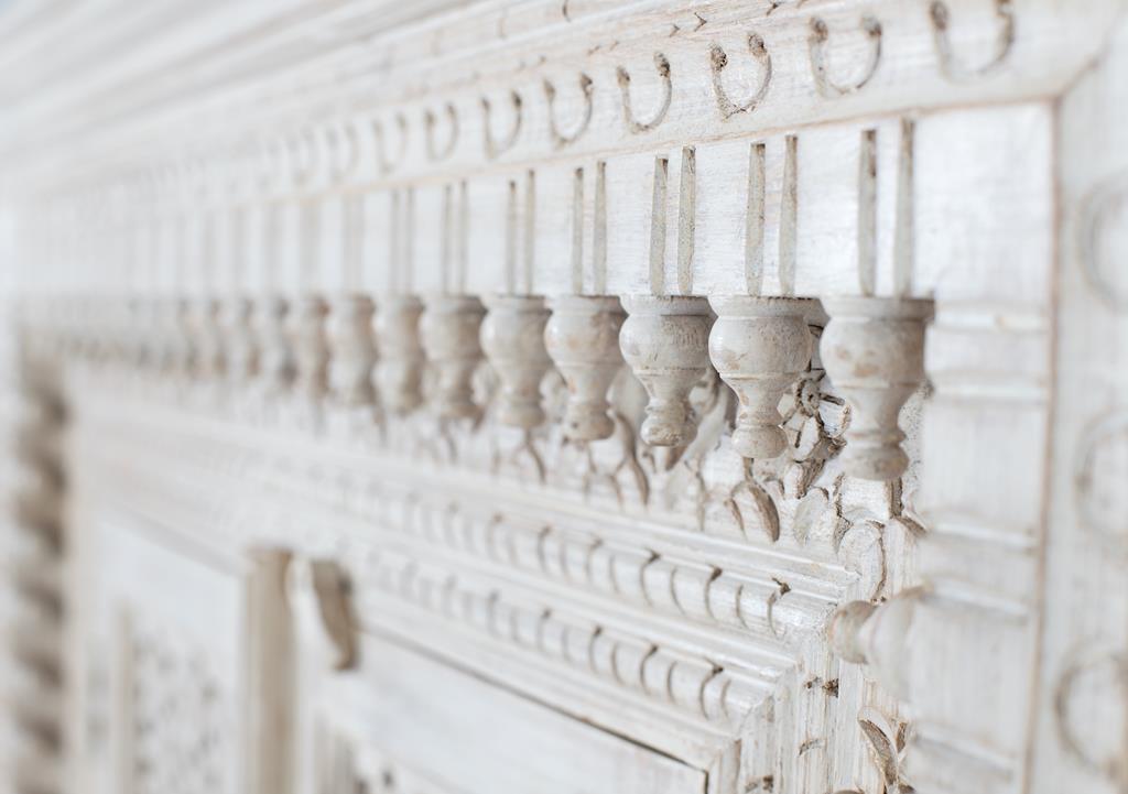 Aparador fabricado en madera maciza de mango en color blanco envejecido, con 2 puertas, todo talladao a mano, en el interior de las puertas lleva 1 estante interior. Al ser madera matural puede venir con sus nudos y vetas originales.