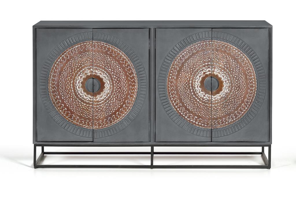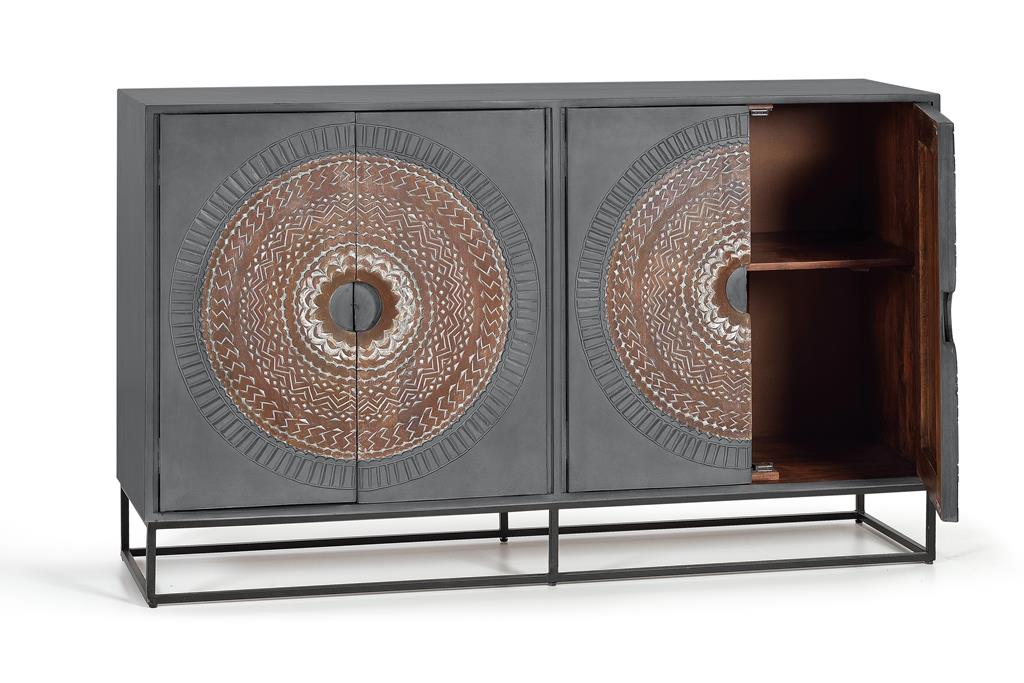 APARADOR 4 PUERTAS EN MADERA DE MANGO Y BASE DE METAL, CON DETALLES DE LAS PUERTAS TALLADAS A MANO.