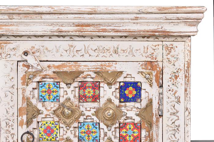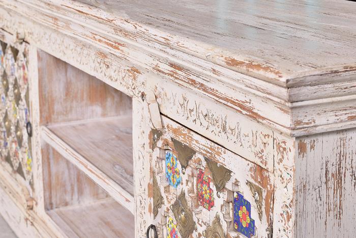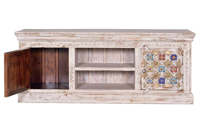 MUEBLE T.V. EN MADERA DE MANGO, DETALLES EN AZULEJO Y BRONCE.