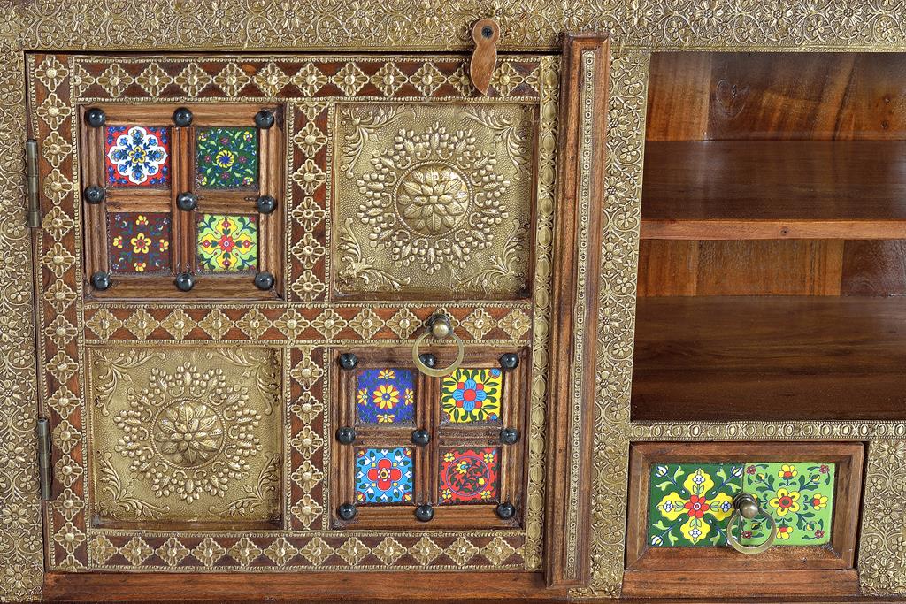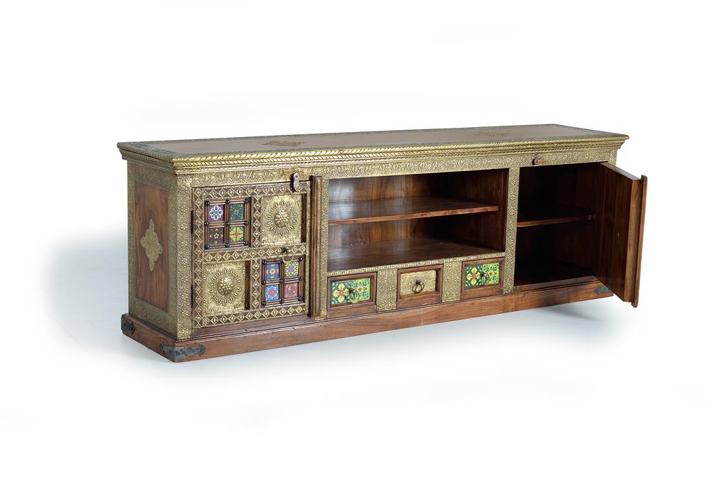 MUEBLE TV EN MADERA DE ACACIA MACIZA CON APLICACIONES EN AZULEJO Y BRONCE REPUJADO CON 2 PUERTAS, 3 CAJONES Y ESTANTE CENTRAL.